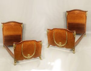 A Beautiful Pair of Late 19th Century Transitional Style Gilt Bronze Mounted Inlaid Marquetry and Parquetry Twin Size Beds