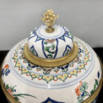 Hand painted with four similar landscape scenes with a woman at leisure, surrounded with floral arrangements and bouquets, the top headed with a gilt bronze berry finial and sitting on a bronze base.