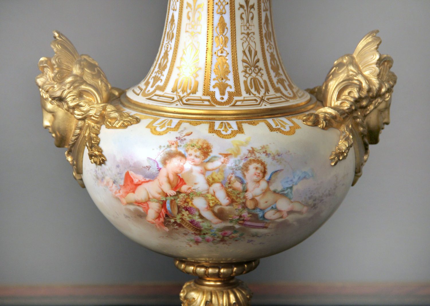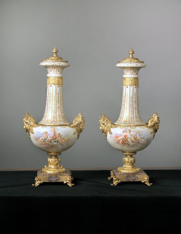 Gilt bronze tops above a long neck with raised gold designs. The painted fronts each with scenes of cherubs, flowers, birds and fruit, the reverse with trophies, instruments and fruit. Each side with a bronze mask of a woman and tiara sitting on a colorful enamel base.