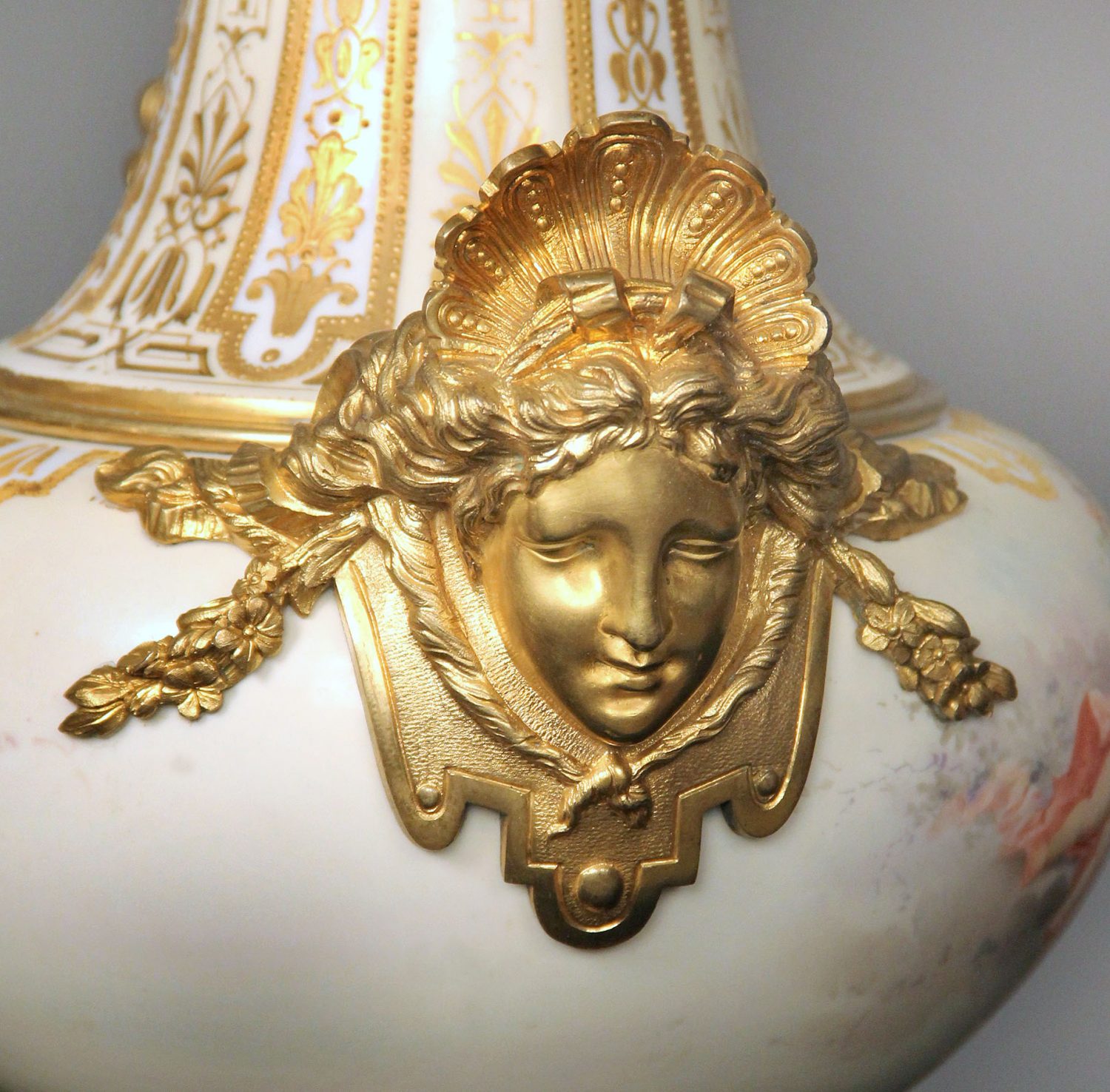 A Beautiful Pair of Late 19th Century Gilt Bronze and Champlevé Enamel Mounted White Sèvres Style Vases