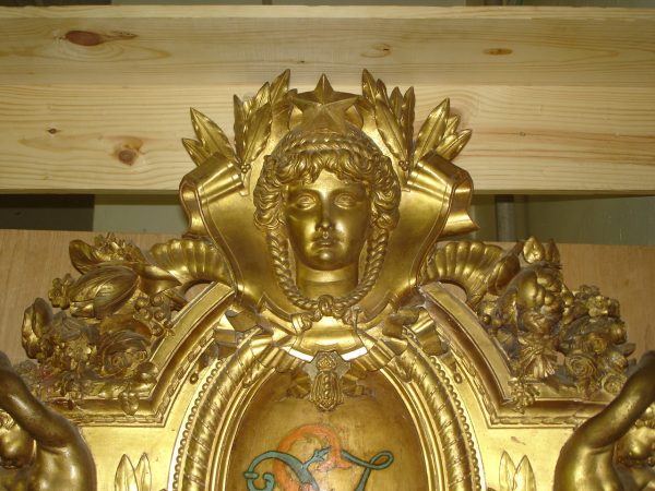 The elaborately designed mirror with female figures rising from pedestals to either side, at top putti emerge from scrolling foliate flanking a central monogrammed cartouch crowned with female mask with star atop, at base scrolling foliate meet over a horn and pan flute.