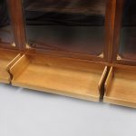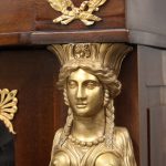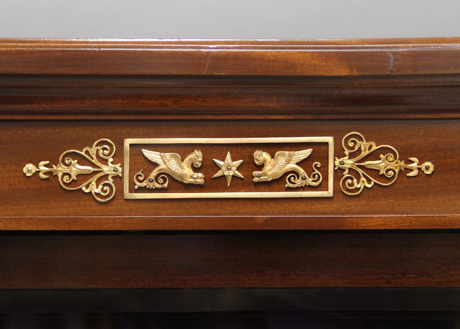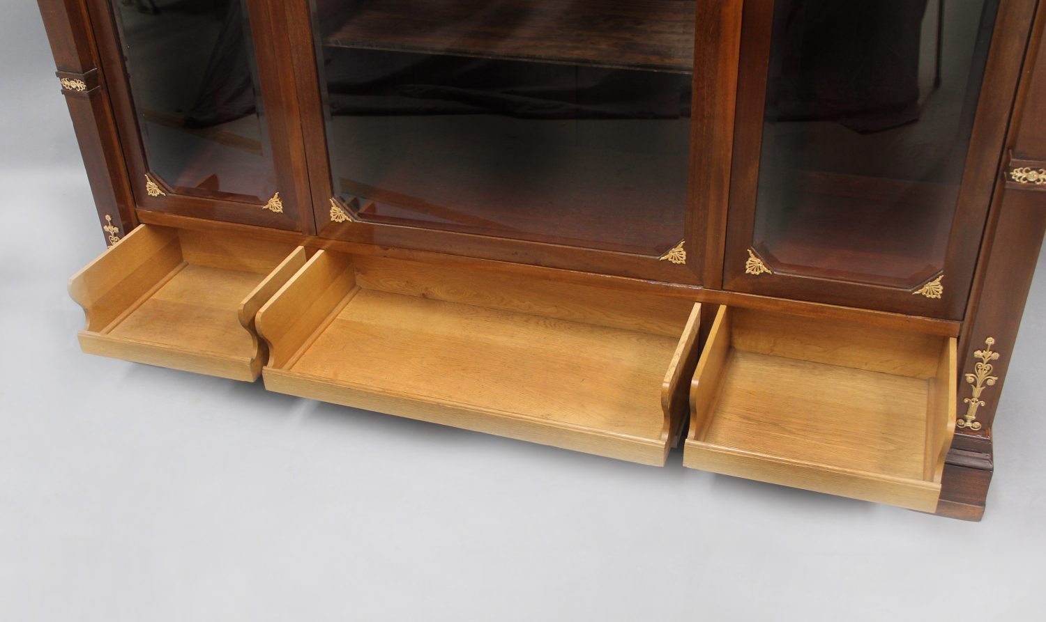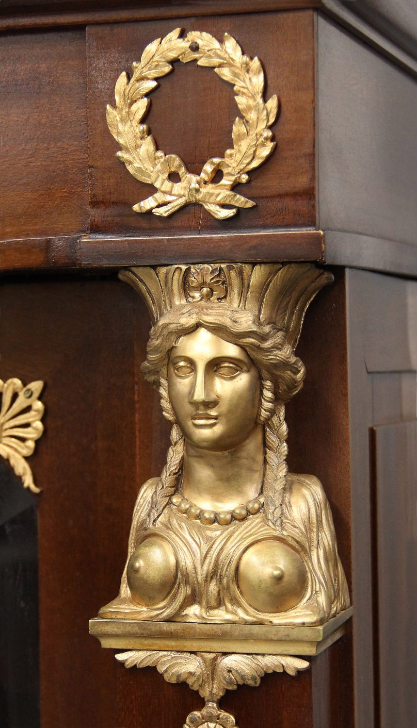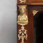 The long rectangular top adorned with bronze mounts of flying griffins, above three large glass doors which open to shelves, the top corners mounted with large busts of beautiful Egyptian goddesses, the bottom with three drop-down fronts that conceal long and deep drawers for hidden storage.