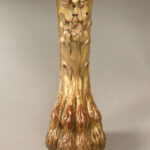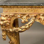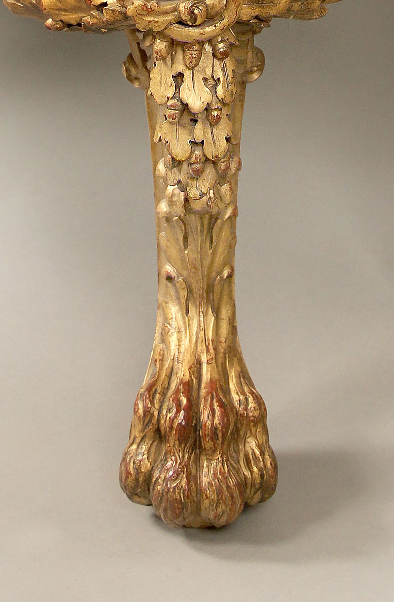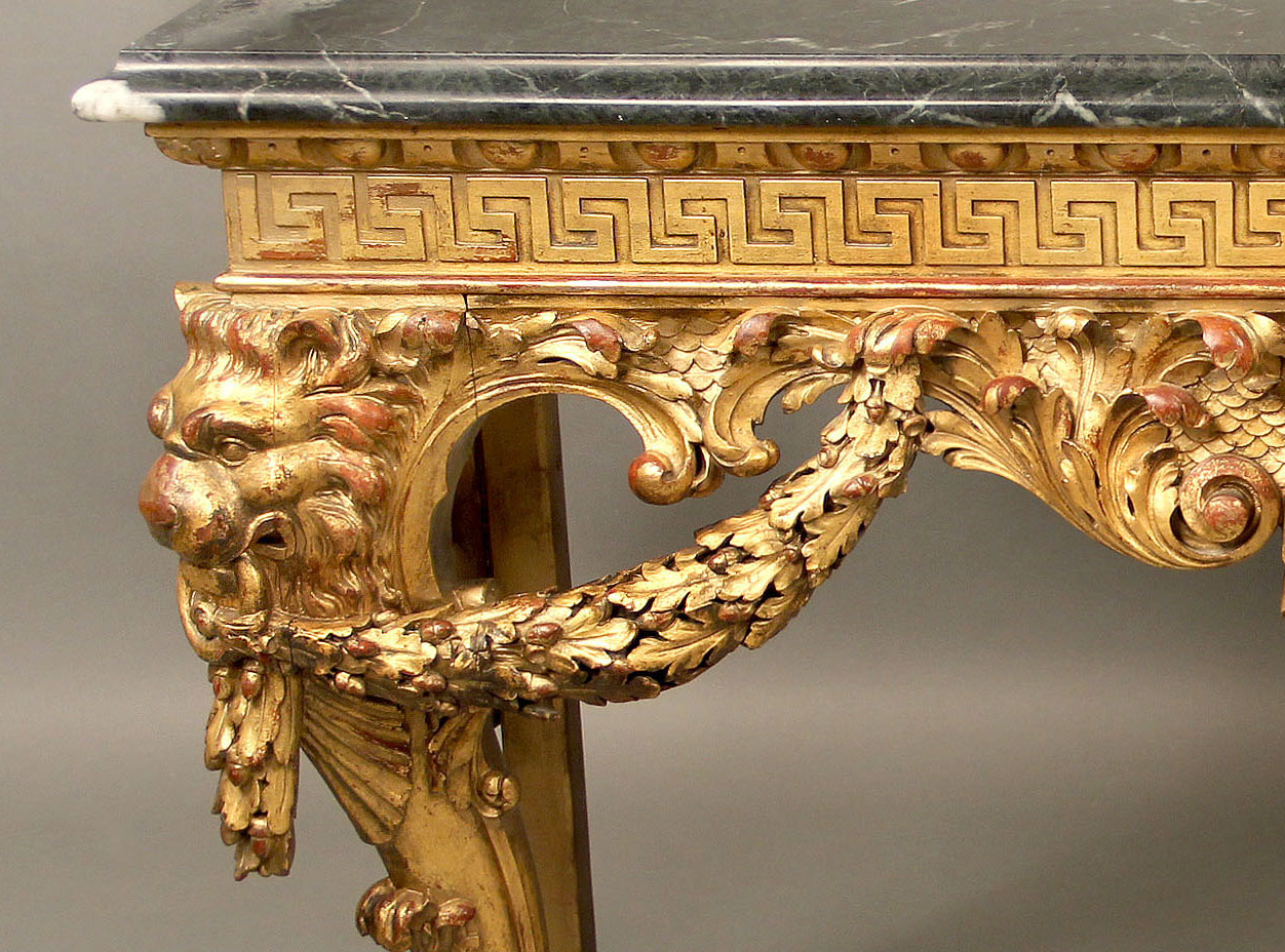A green marble top above a carved frieze, the designed console centered with a female mask with curtains and laurel swags, the legs with fierce lion faces and sitting on hairy paw feet.