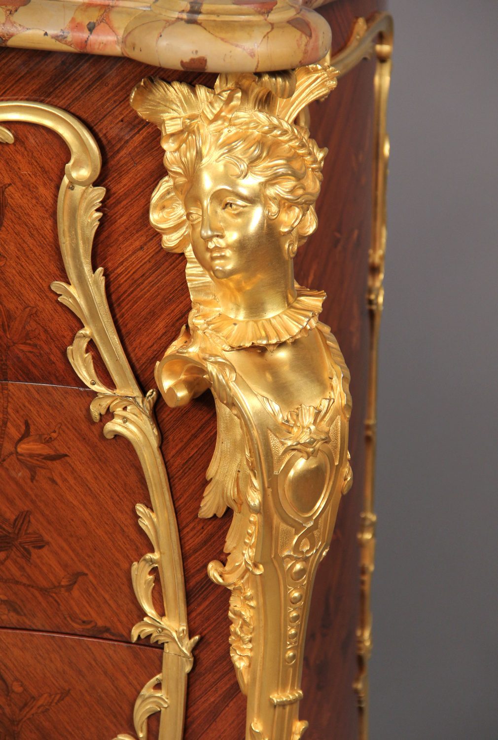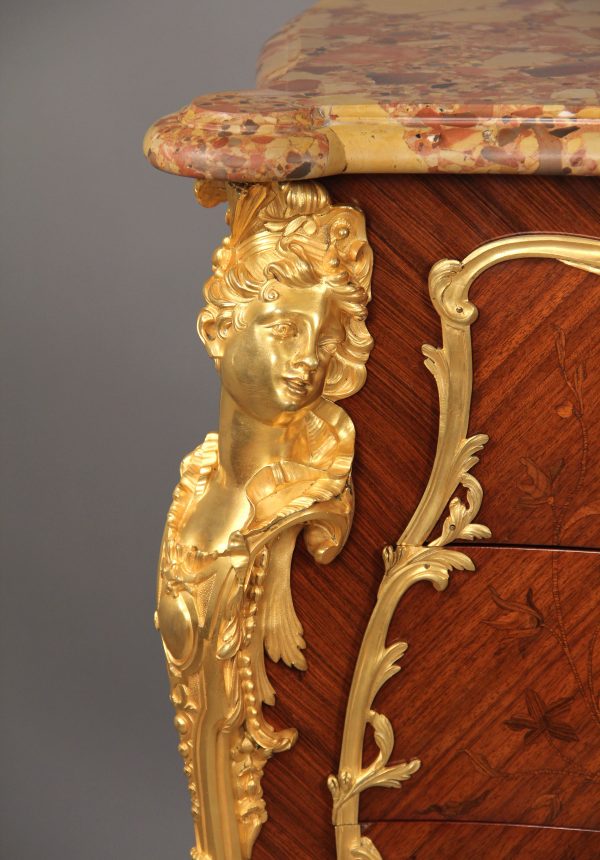 Linke was born in Pankraz in Bohemia and was celebrated by the French as one of the greatest ébénistes of meubles de style at the turn of the century. He began his apprenticeship with a Bohemian master at the age of thirteen. Four years later, he toured Austria, settling and working in Vienna for two years. Linke arrived in Paris in 1875, and by 1881 he had established his own small workshop at 170 rue du Faubourg St. Antoine. Taking 18th century styles as his starting point and adapting earlier styles to contemporary taste, Linke produced fine quality furniture, steadily expanding his business during the next 20 years. He firmly established his reputation after receiving a gold medal at the Paris Universal Exhibition of 1900 for his extraordinary Grand Bureau. He continued to use international fairs as a means of exploring new markets, exhibiting at the 1904 World’s Fair in St. Louis, the Liege in Belgium and the 1908 Franco-British exhibition in London. Linke’s highly original designs sprang from the Régence and Rococo styles but were imbued with something quite new – Rococo curves were laden with gilt-bronze sculptural mounts in the tradition of A.-C. Boulle (1642-1732) or Charles Cressent (1685-1758). Stylistically, the new designs still adhered to the Rococo; the novelty, however, was Linke’s fusion of the Rococo with the liveliness and the fluidity of the ‘art nouveau’. The Revue called Linke’s creations entierement nouveau, and continued to say that ‘Linke’s stand is the biggest show in the history of art furniture in the year 1900…’ The mounts, or rather sculpture, were characteristic of the finest pieces from the Linke workshops. The most original designs were almost certainly created in collaboration with the enigmatic sculptor Léon Messagé, who excelled in creating lively, high relief, allegorical figures recalling the styles of Boucher and Falconet.