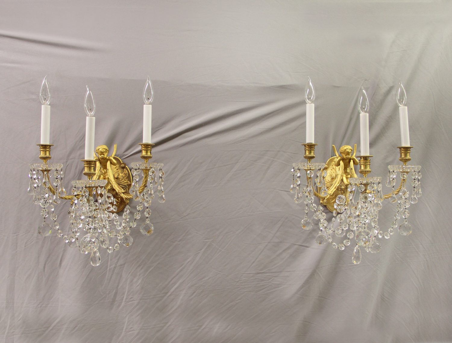 Each appliqué having an oval acanthus cast backplate issuing three scrolling candle arms supported by a finally modeled putti figure and terminating in a circular gadronned nozzle and glass drip pans. The appliques hung all over with faceted drops and swags.