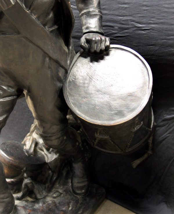 Depicting a life size French soldier boy marching with his drumsticks in one hand up in the air and holding a large drum in the other, his cap lying on the ground.