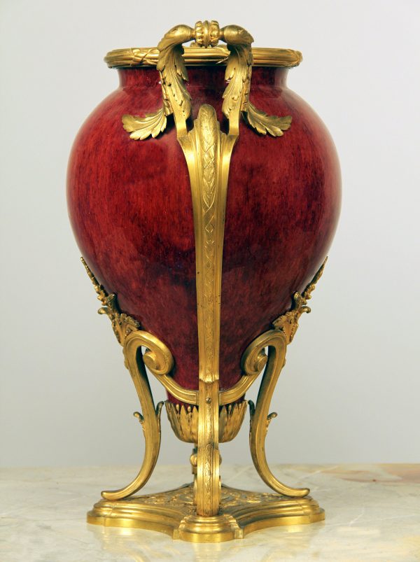 Beautiful “Sang de Boeuf” French porcelain with bronze mounted arms, sitting on a foliage designed bronze stand with four legs.