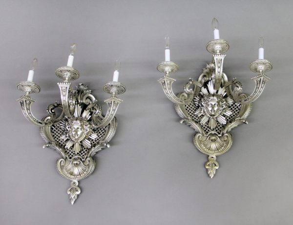 A Very Fine Pair of Late 19th Century Silvered Bronze Three Light Sconces