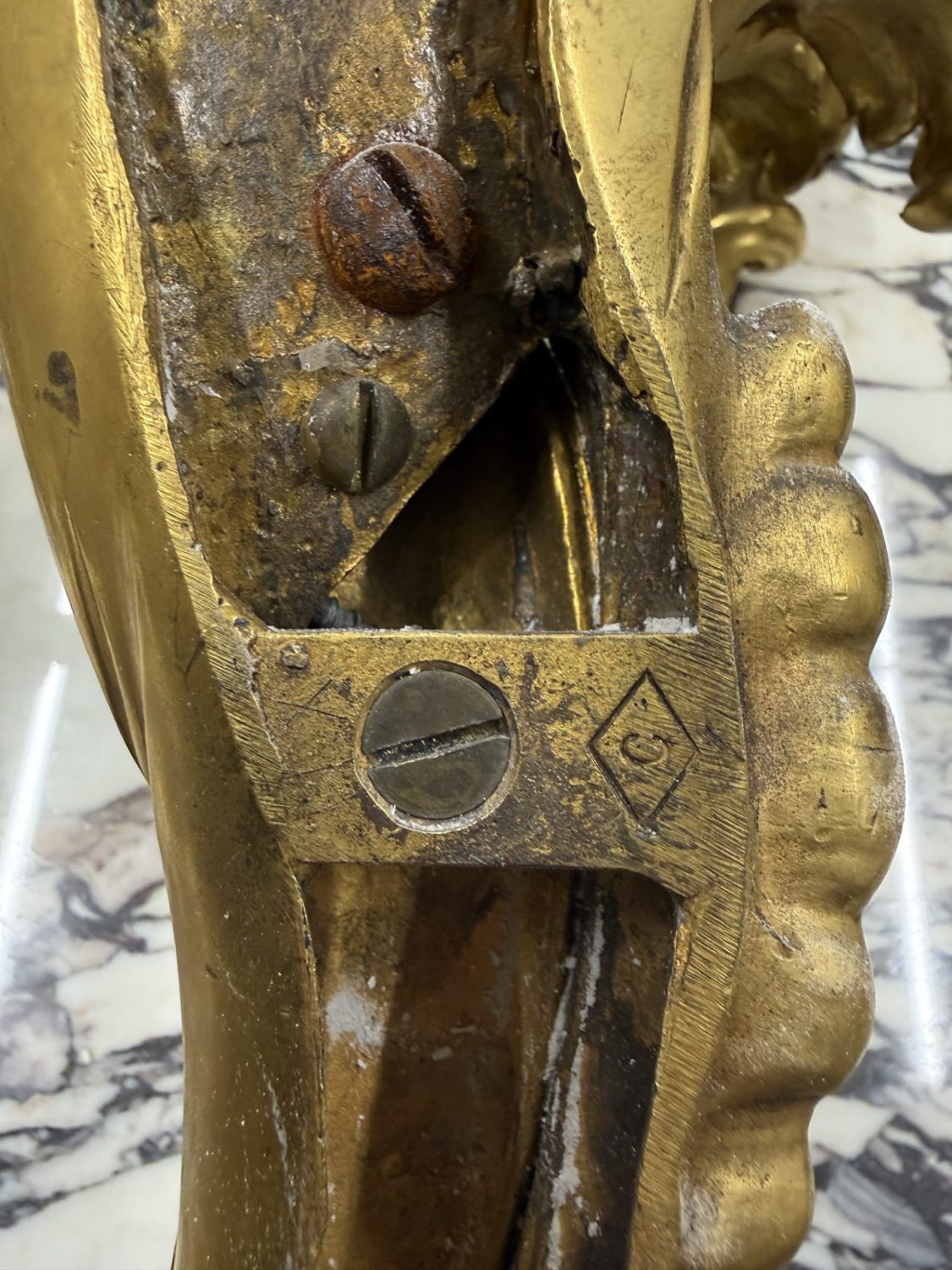 The beautiful foliate-scolled backplate supporting five tiered, great quality chiseled acanthus candle branches, leading down to a wavy casted base.