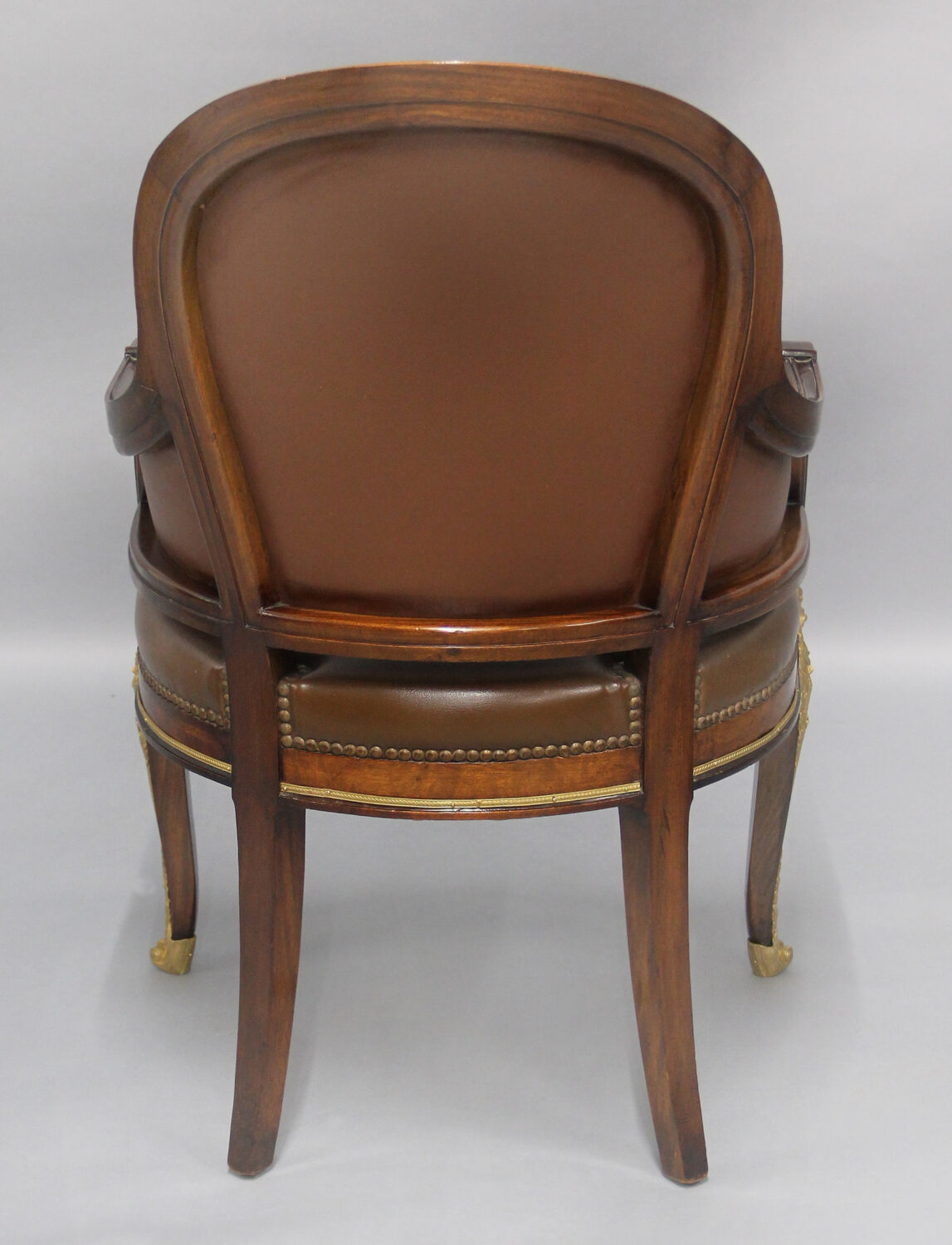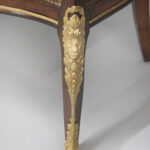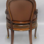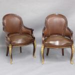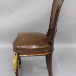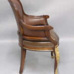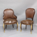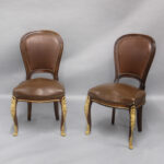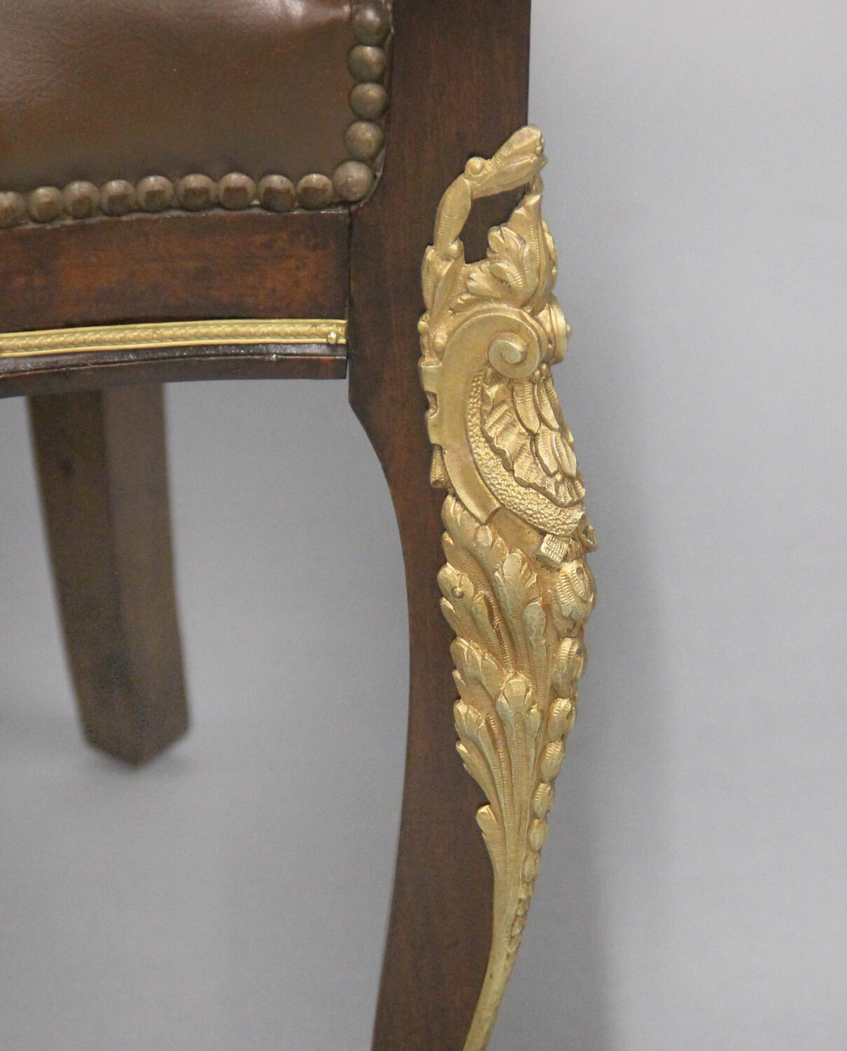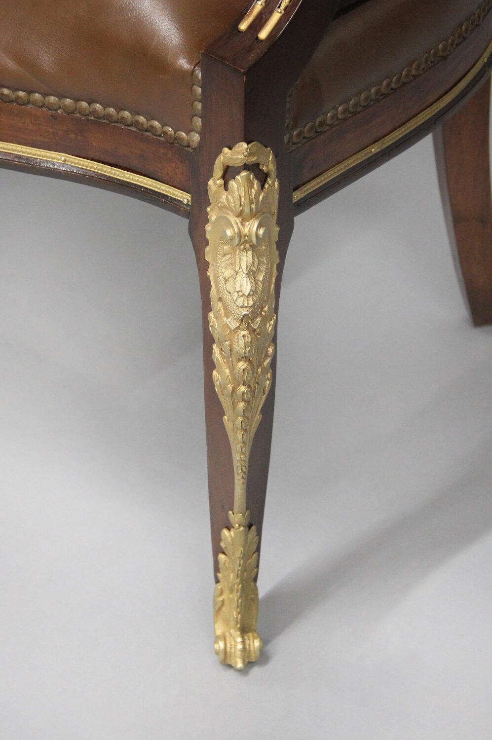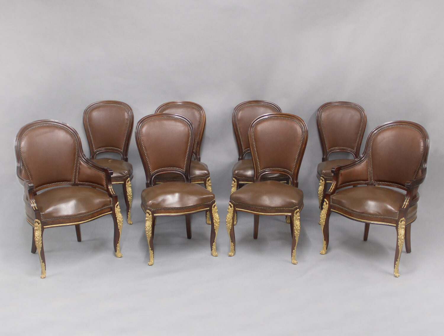 Comprising of two arm and six side chairs with rounded seat backs, the armchairs closed around the sides, the front legs with nice acanthus designed bronze mounts leading down to foliate-cast sabots.
