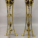 Each tin lined tapering jardinière supported by triple Apollo mask suspending floral garlands joined by a tri-form stretcher surmounted with an urn, on lion paw feet.