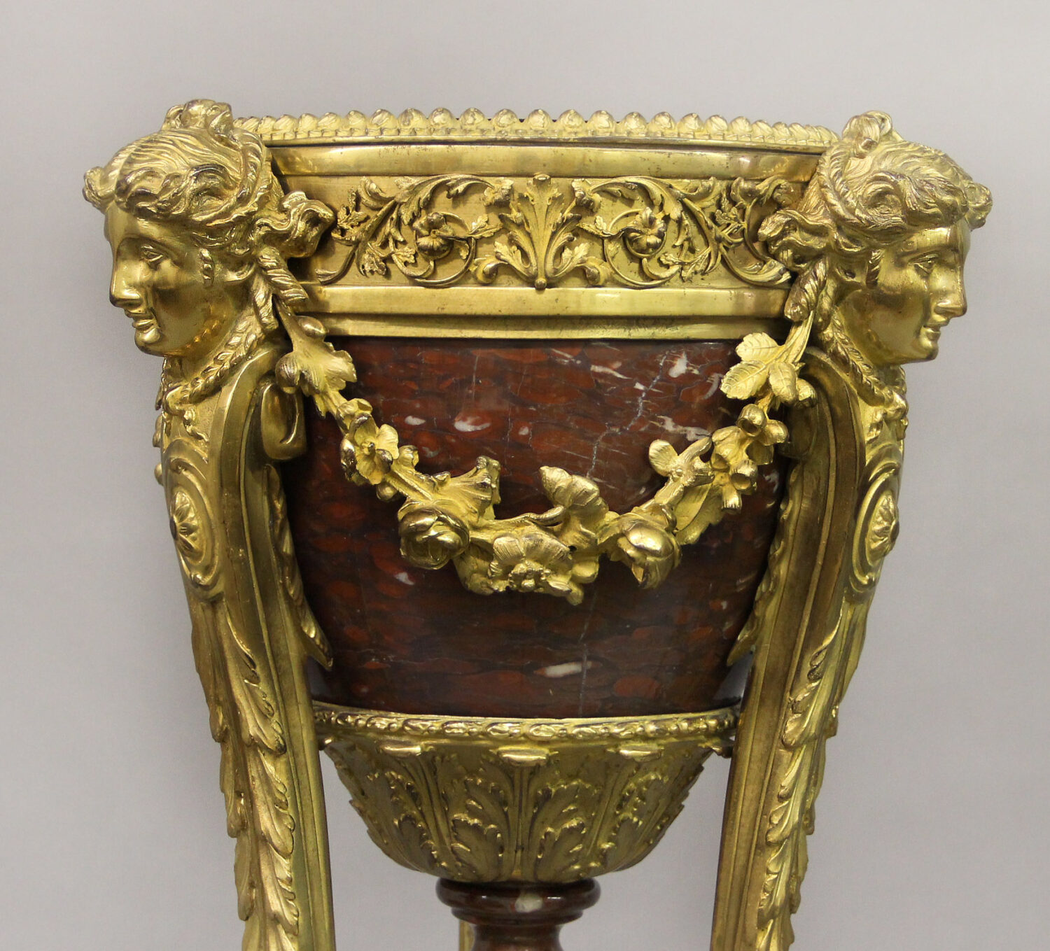 An Excellent Quality Pair of Late 19th Century Regence Style Napoleon III Gilt Bronze and Rouge Griotte Marble Jardinieres-on-stands