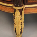 The same model but with lacquer panels was exhibited at Beurdeley’s stand at the 1867 Paris exhibition, where he won the gold medal. Phillip Bury commented at the exhibition on the fine quality of the chasing and gilding of Beurdeley’s work which reached a standard rarely, if ever, surpassed by other Paris makers. Two distinctive Beurdeley features can clearly be seen, the pearl beading around the frieze panels and the diamond paterae in gilt bronze “joining” the trellis.