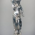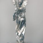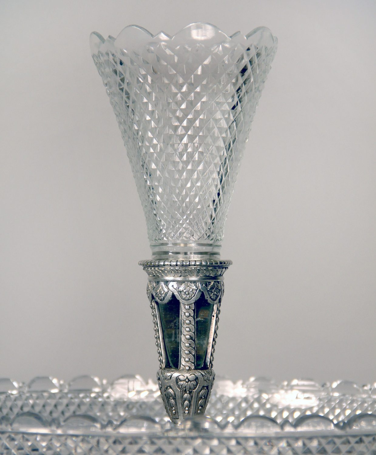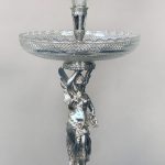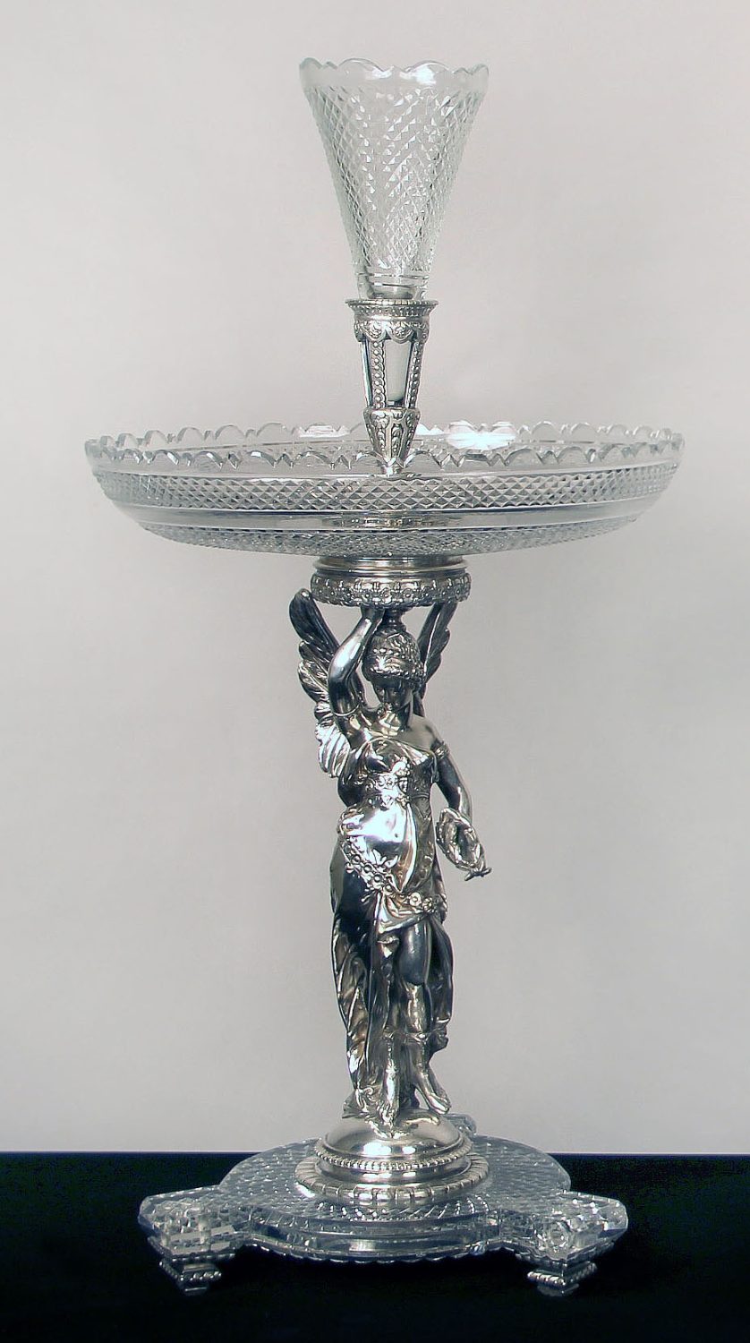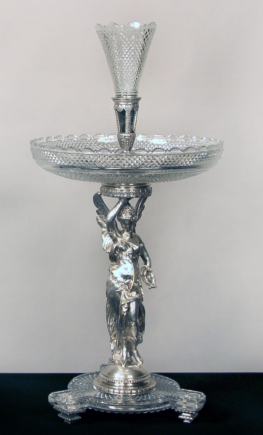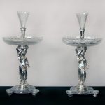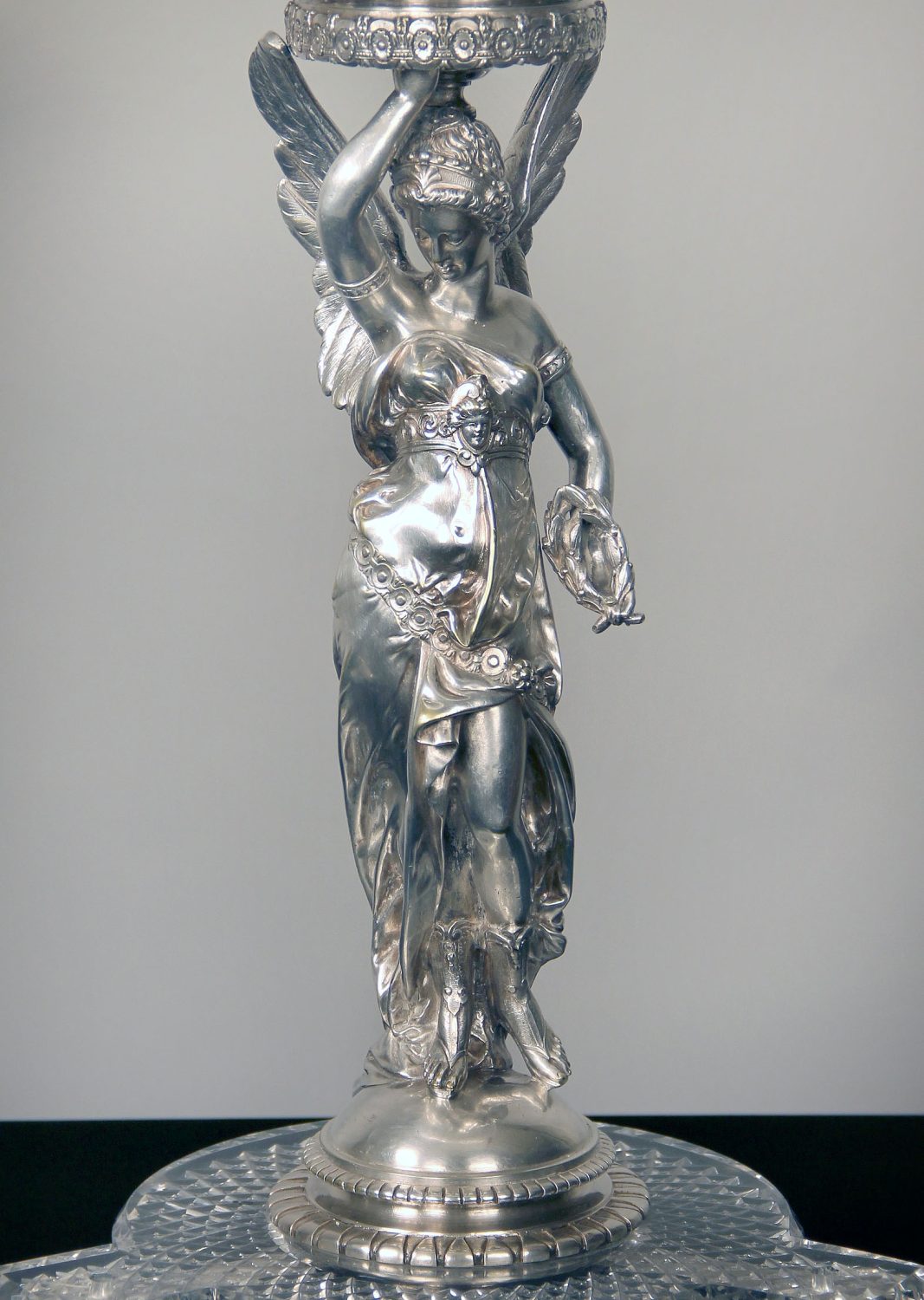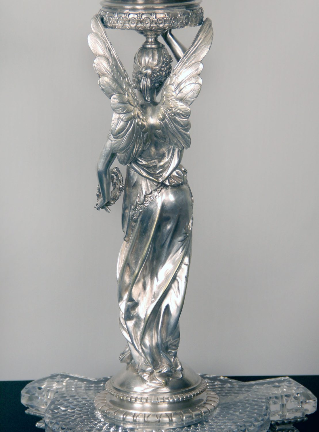 The large and superb pair modeled as “Nike”, the Greek Goddess of Victory, personifying triumph in both war and peaceful contests like athletics, art, and music. The removable top designed with a candle shaped crystal flute above a round crystal plate, all standing on a crystal tripod base with silver plated feet.