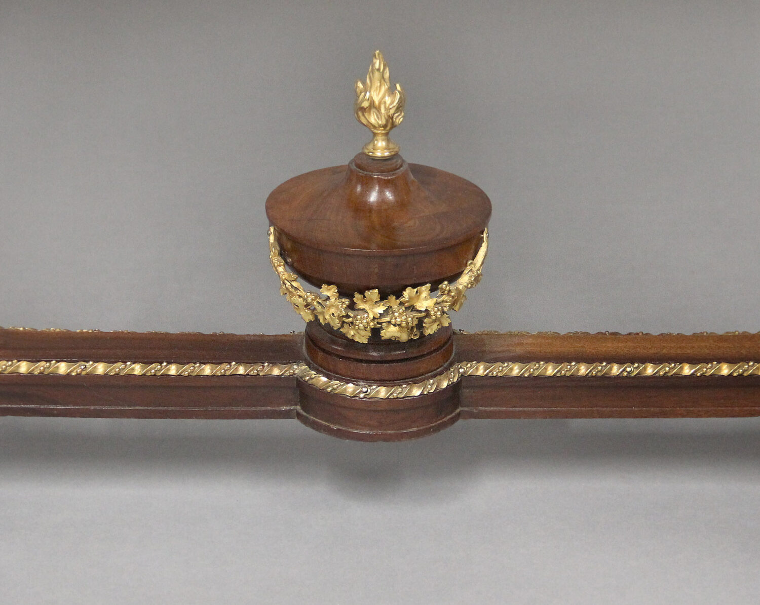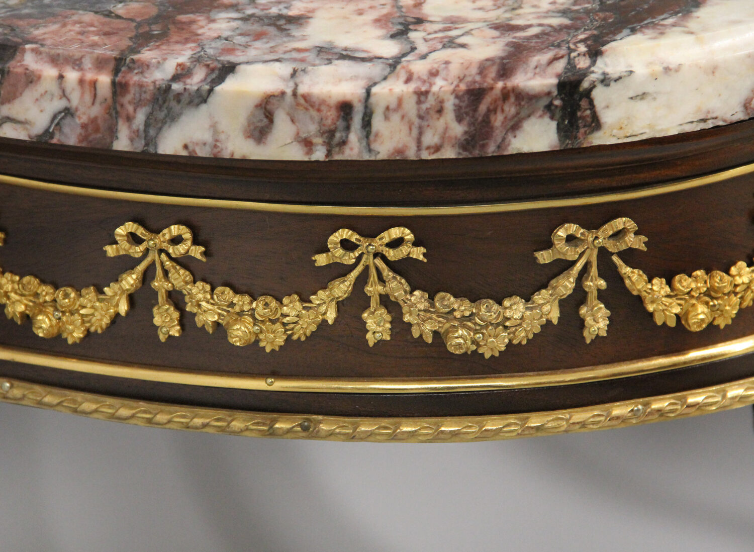 The demilune fleur de pecher marble top above matching bronze mounts depicting satyrs carrying a drunken Bacchus flanked by ribbon-tied floral swags, the curved sides with similar designs, the tapering legs headed by large flowering mounts joined by an X-form stretcher centered by a flaming finial encircled by grape vines.