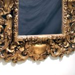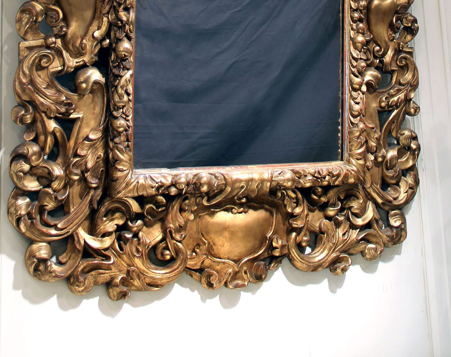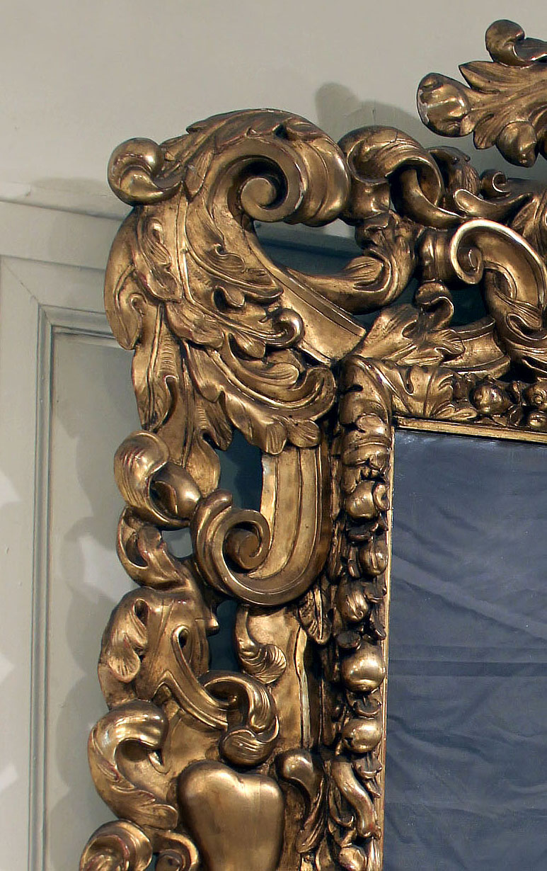 The large and wonderfully carved rectangular mirror surrounded with sprawling acanthus leaves, the inset part of the frame with carved fruits and flowers, the central top designed with a shell surrounded by curling foliage.