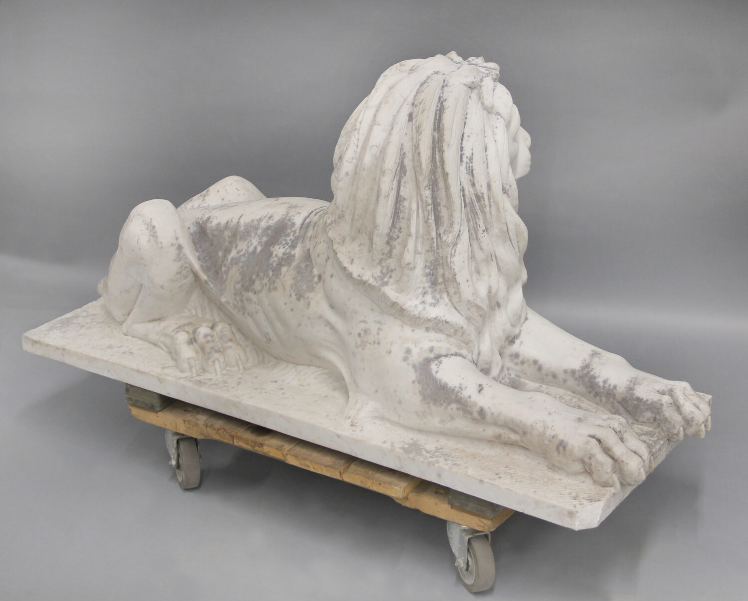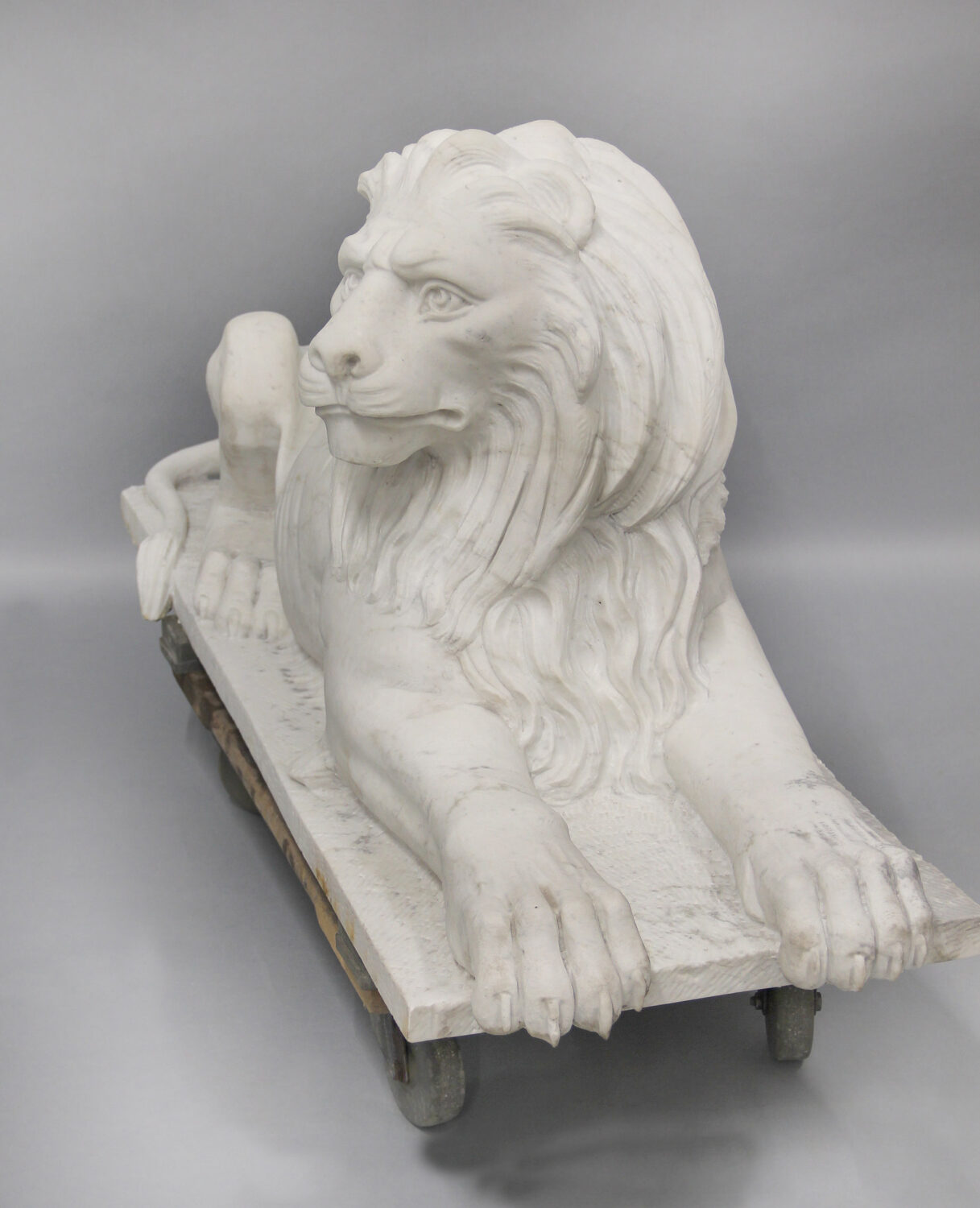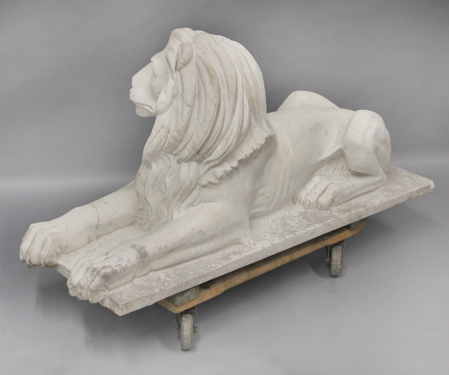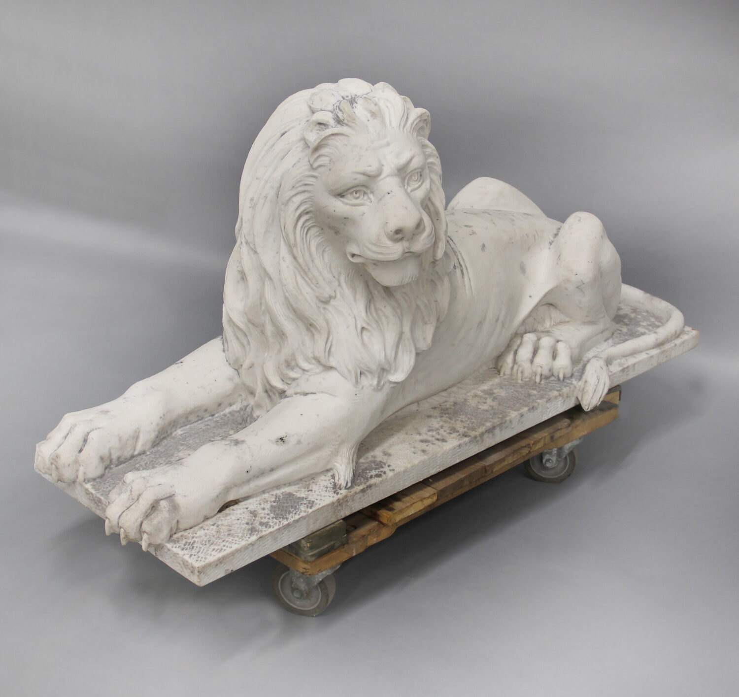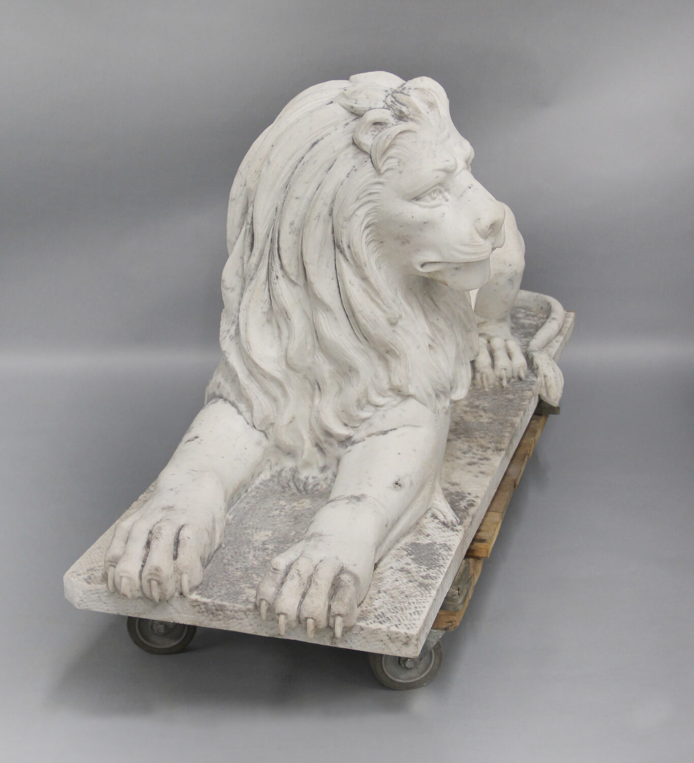 An Impressive Pair of Late 19th Century Carved Carrara Marble Recumbent Garden / Gatekeeper Lions