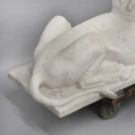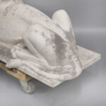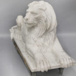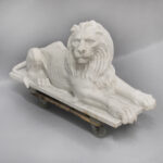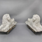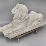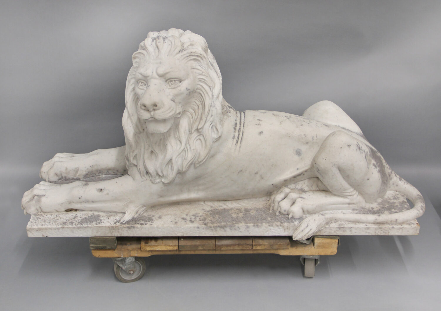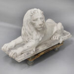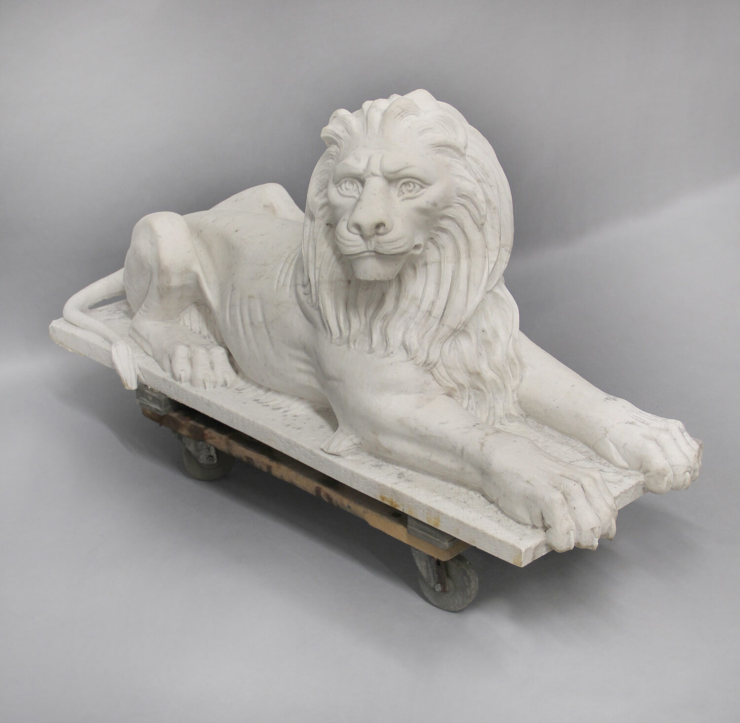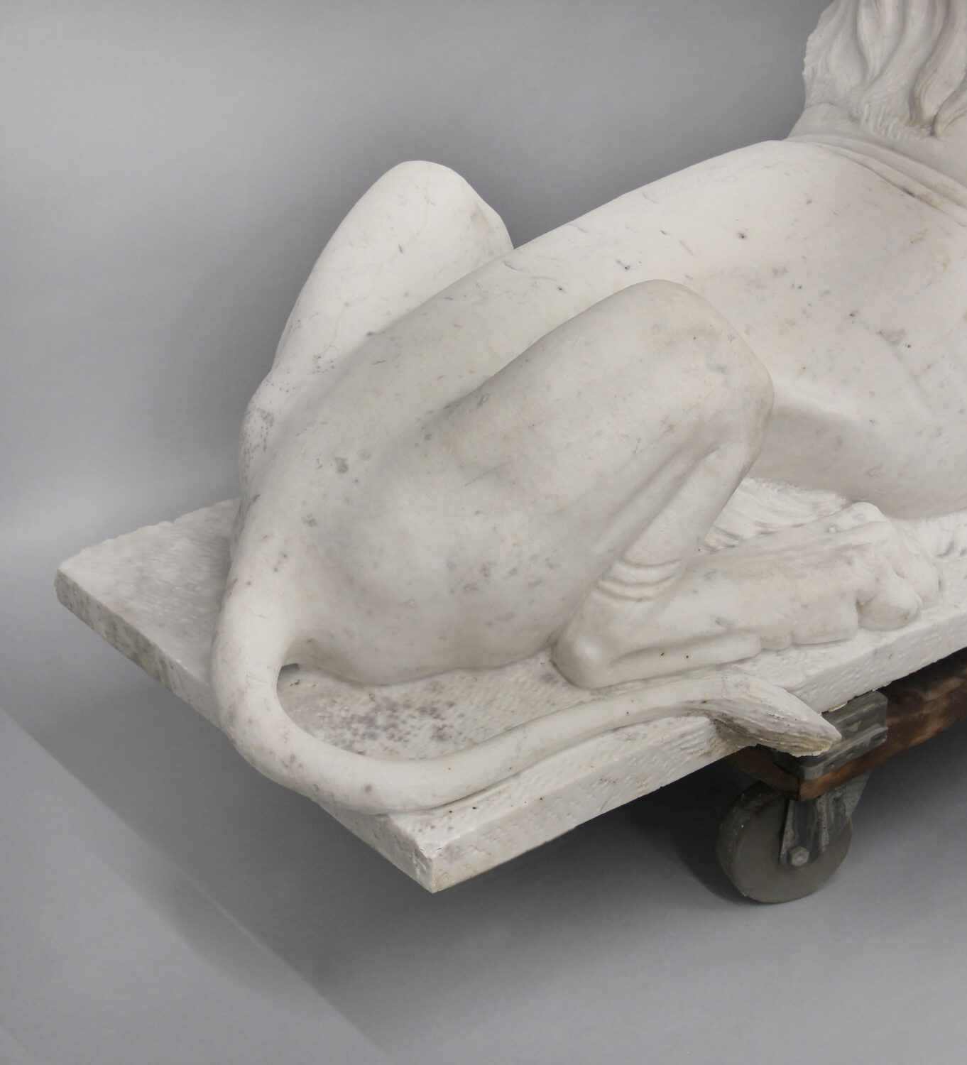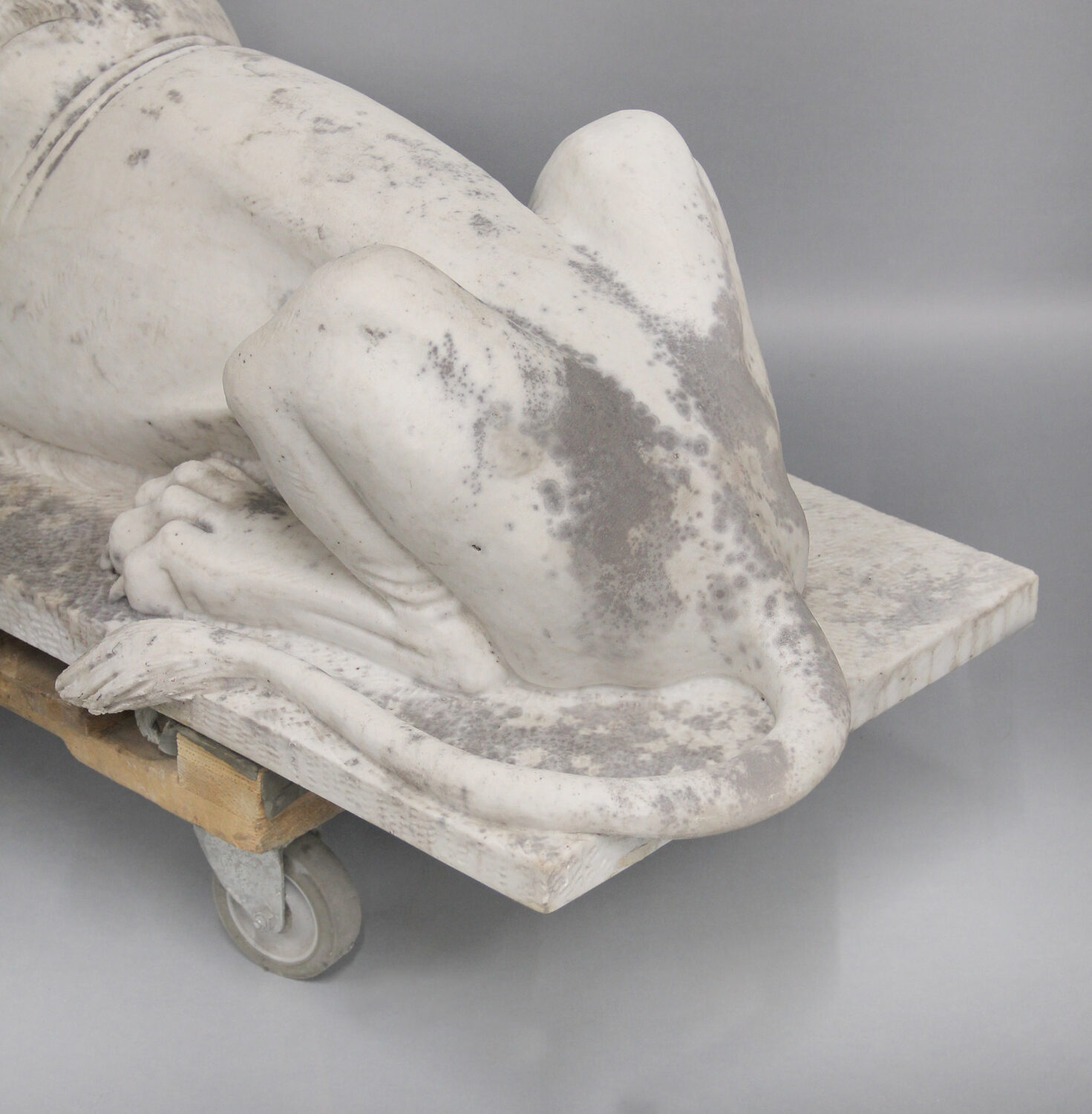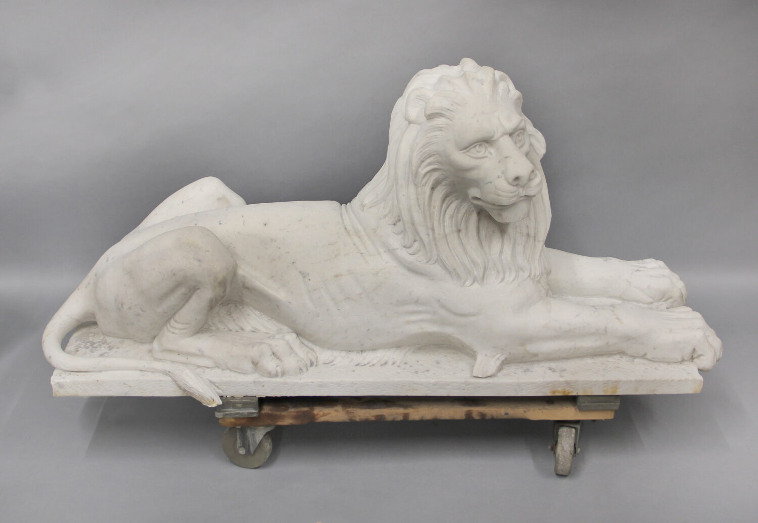 An Impressive Pair of Late 19th Century Carved Carrara Marble Recumbent Garden / Gatekeeper Lions