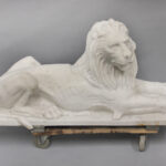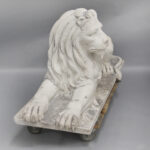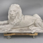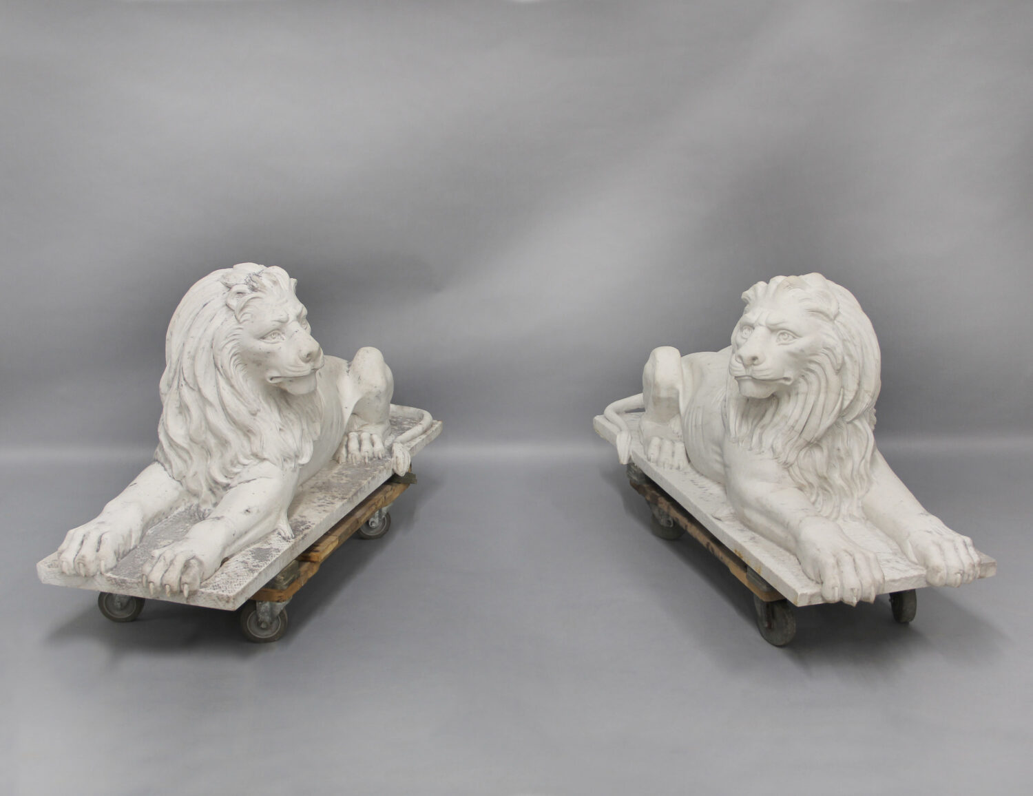 The wonderfully hand carved life-size lions are laying, front legs stretched, with their heads and chest raised at attention. The excellent quality of the lions face, body and features almost certainly means that they were commissioned to guard a large chateau or building.
