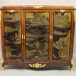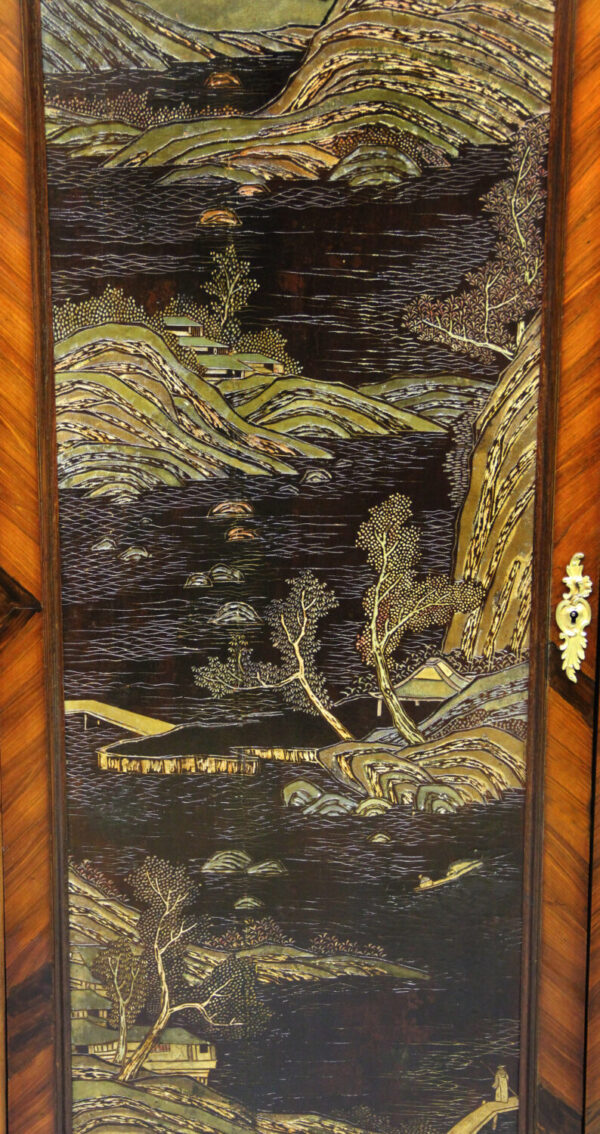 Not much is known about the life and career of Bontemps – not even his given name or address are on record. However, it is clear that he was a well established maker; if not the very top rung, he can certainly be considered a maker of muebles de luxe. Judging from the listings of his work, it is clear that he favored the use of oriental lacquer, specifically Chinese, some of which looks as though it is considerably earlier than the last quarter of the 19th century, the presumed date of his career. Many of his pieces include late 17th or early 18th century panels taken from folds of Chinese Coromandel screens with rock and water landscapes.