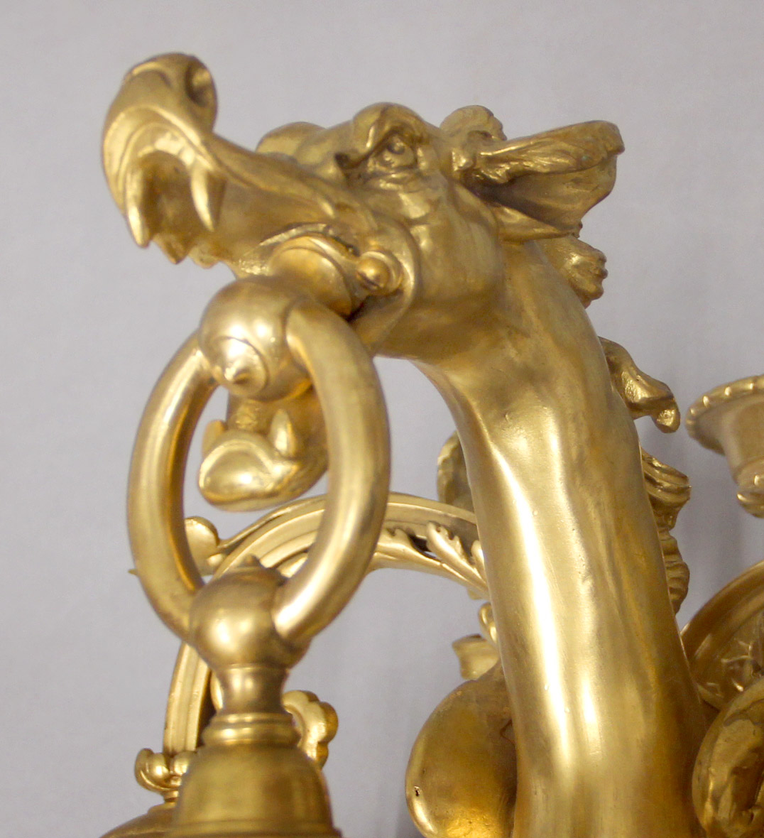 An Interesting Pair of Late 19th Century Gilt Bronze Three Light Dragon Sconces
