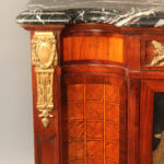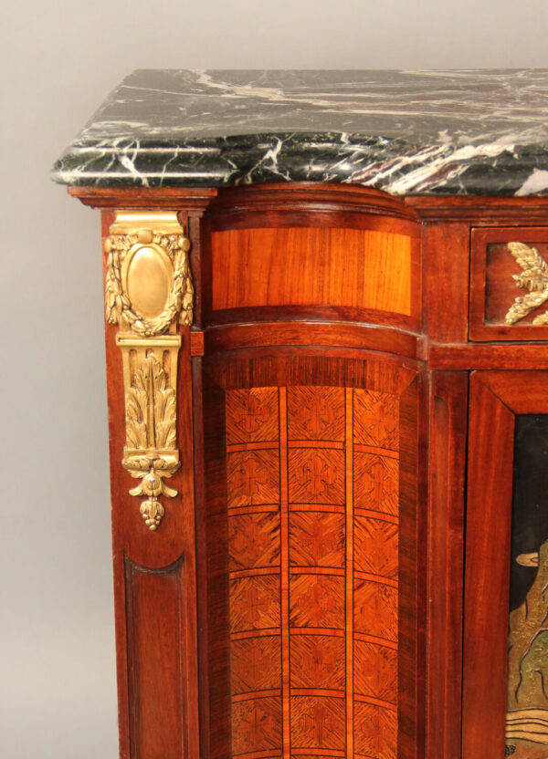 Marble top above a floral bronze mounted drawer, a single door with a coramandel landscape scene of people at leisure, the sides with inlaid marquetry panels.